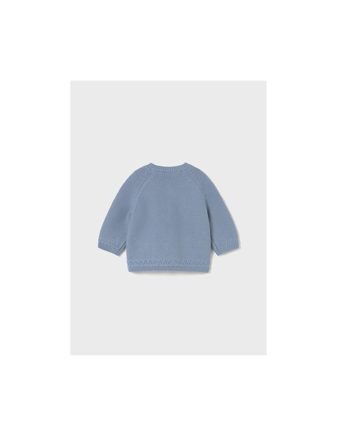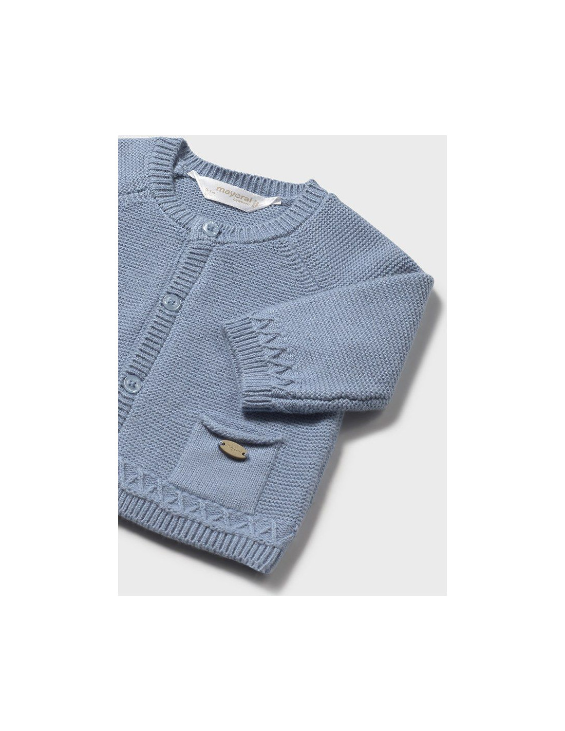 Contine poliamida reciclata. Jacheta tip cardigan cu maneca lunga pentru nou-nascut. Guler rotund. Inchidere cu nasturi pe partea frontala. Tesatura tricotata, moale si placuta la atingere. Buzunare functionale pe partea frontala.